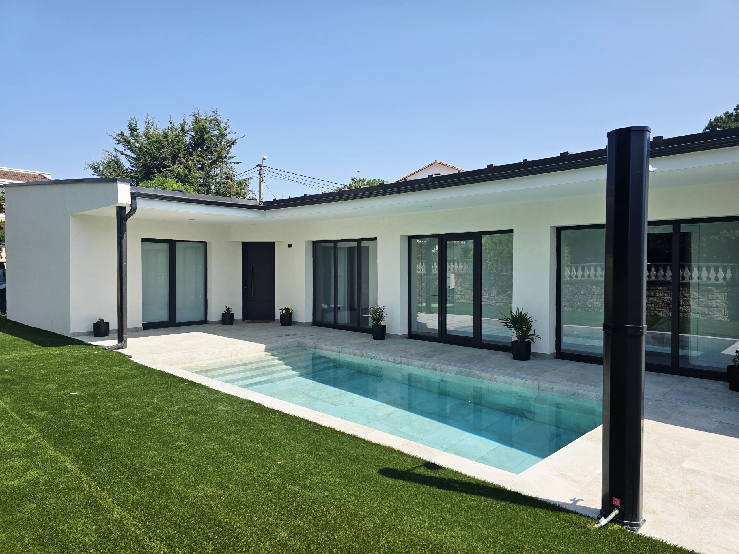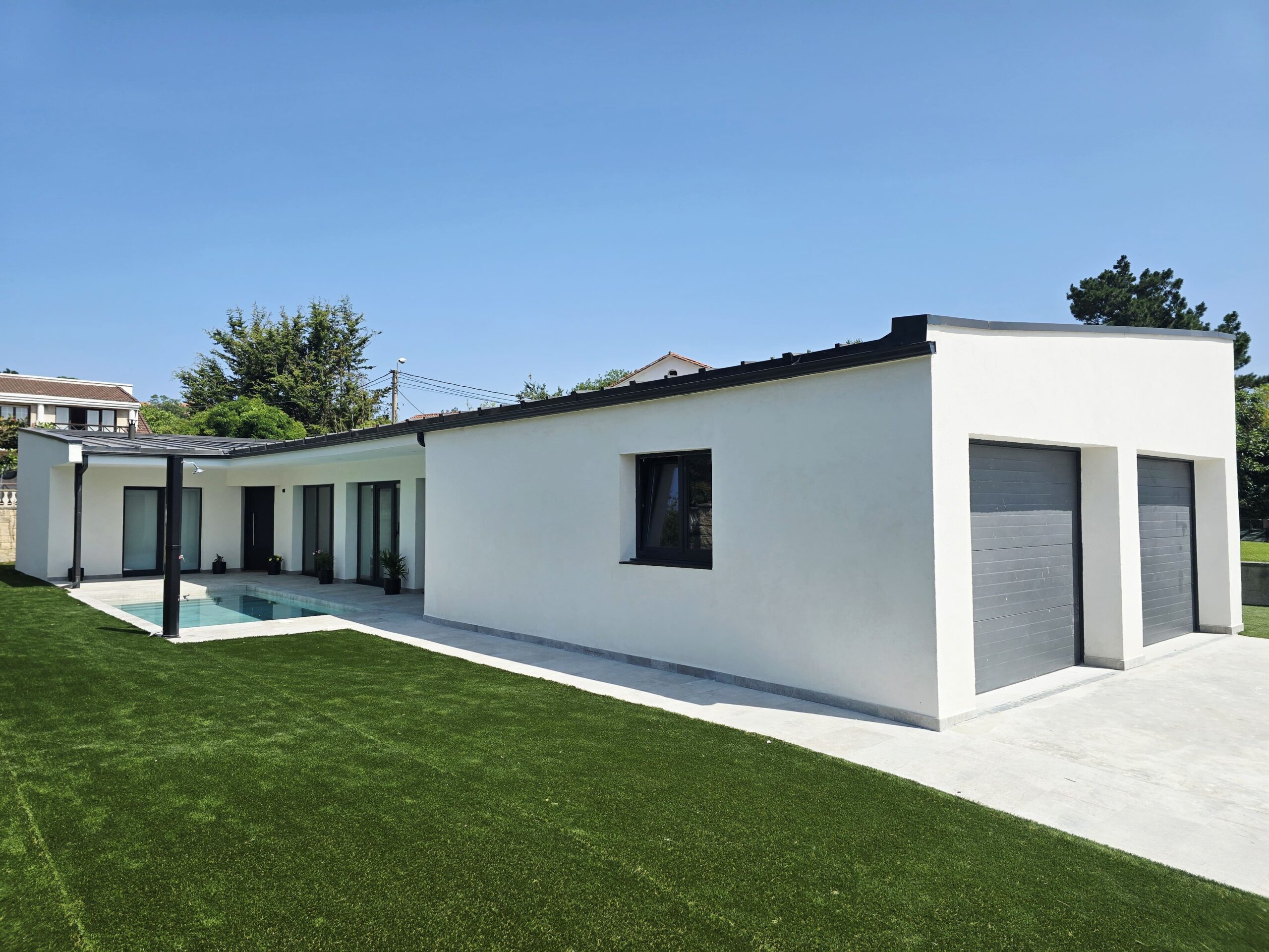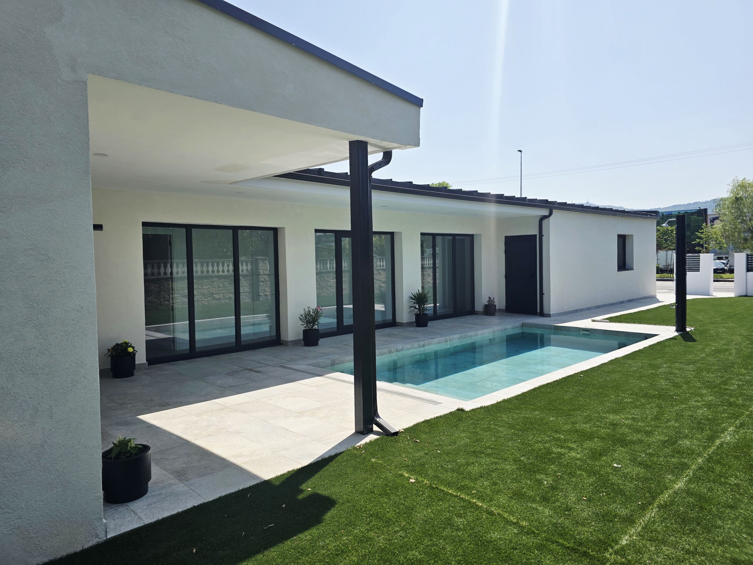 Vivienda de planta baja organizada en torno a una franja exterior continua con piscina y jardín de césped artificial. La envolvente se resuelve mediante SATE para optimizar el aislamiento y eliminar puentes térmicos. Desde ESTART se dirige la ejecución material de la obra, cuidando encuentros del sistema SATE en huecos, carpinterías. El resultado es una casa eficiente y luminosa, pensada para vivir en una sola planta con máximo confort y mínimo mantenimiento.